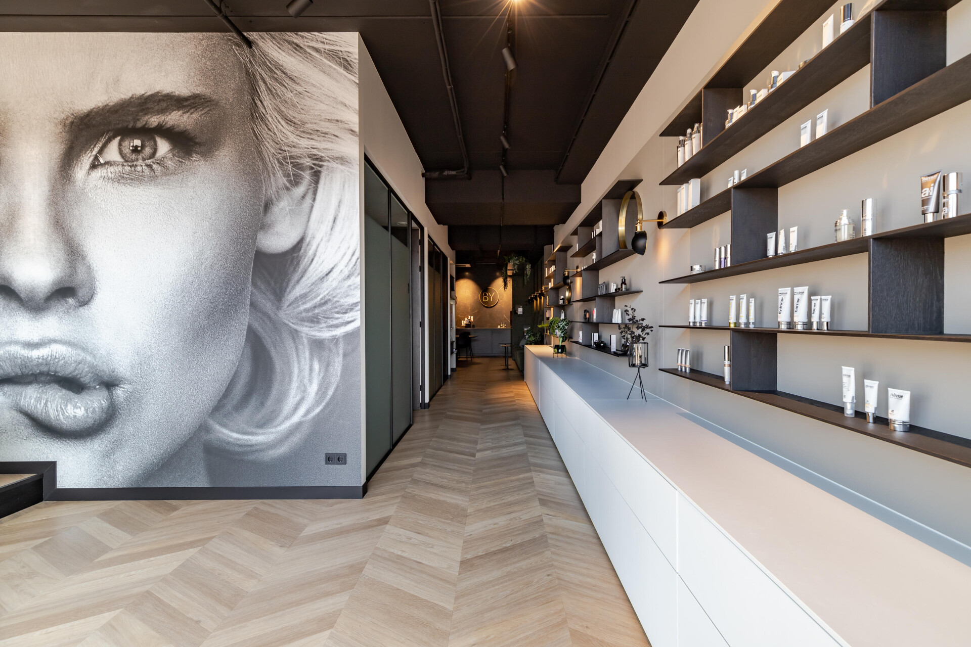 W tym stylowym salonie piękności oprócz funkcjonalności najważniejsze są atmosfera i wygląd. Spokojny kolor podłogi 6542 we wzorze Hungarian point w połączeniu z pięknymi fakturami i materiałami tworzą piękną stylową całość.