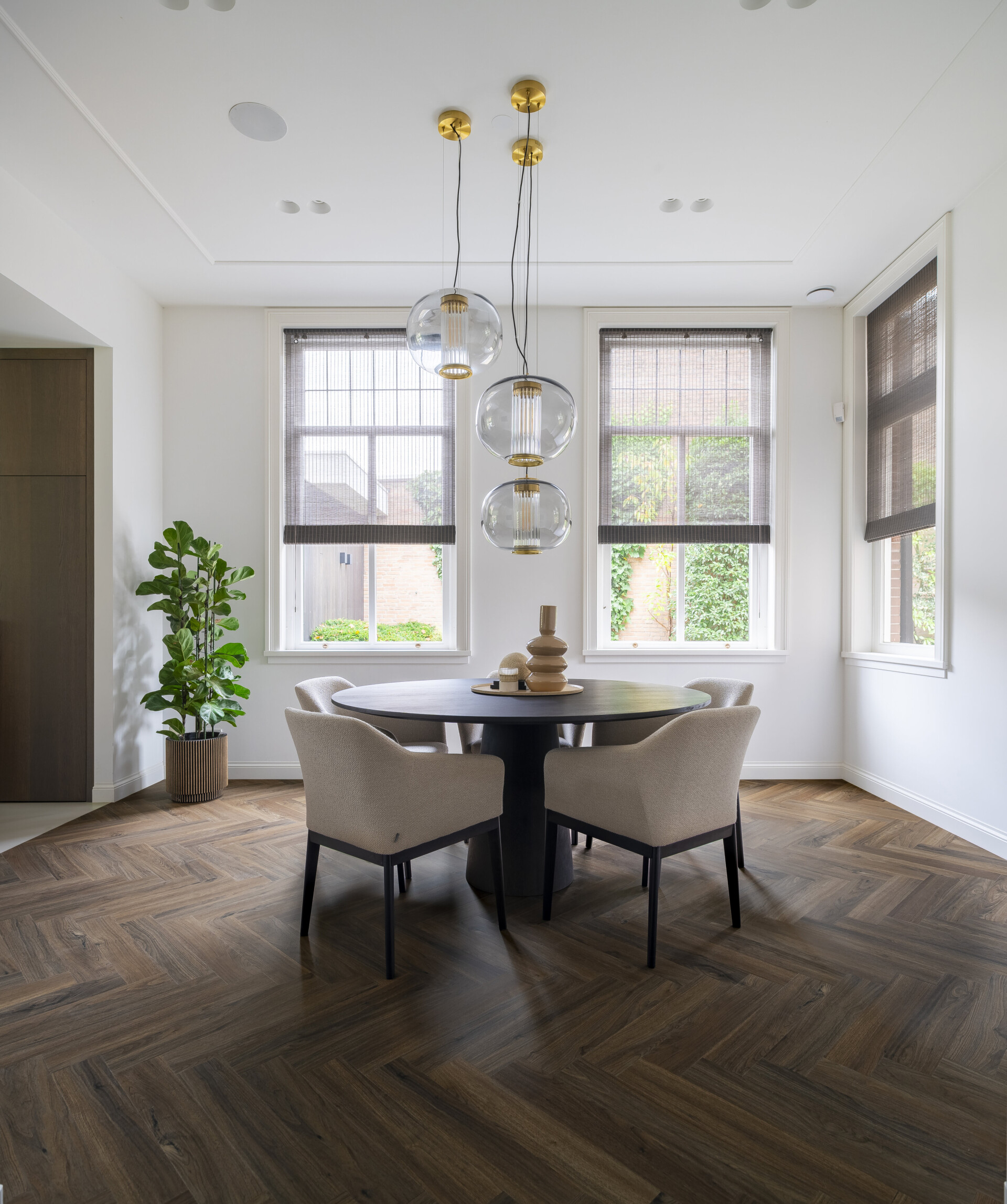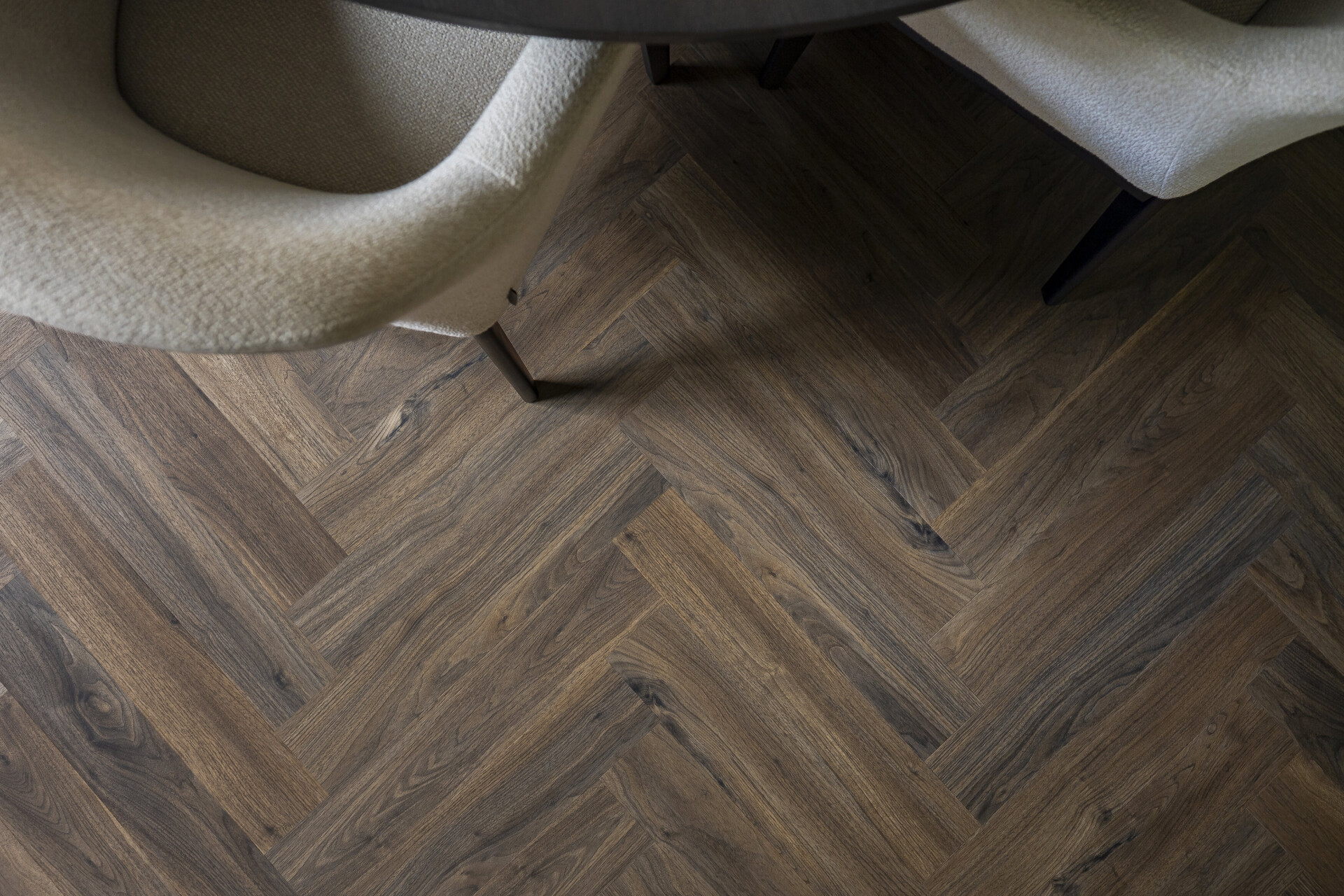 Podłoga w układzie jodełki o wyglądzie orzecha naturalnie wpisuje się w tę aranżację. Głęboki odcień i naturalna struktura drewna wprowadzają do wnętrza dodatkowe ciepło i łączą poszczególne elementy przestrzeni.