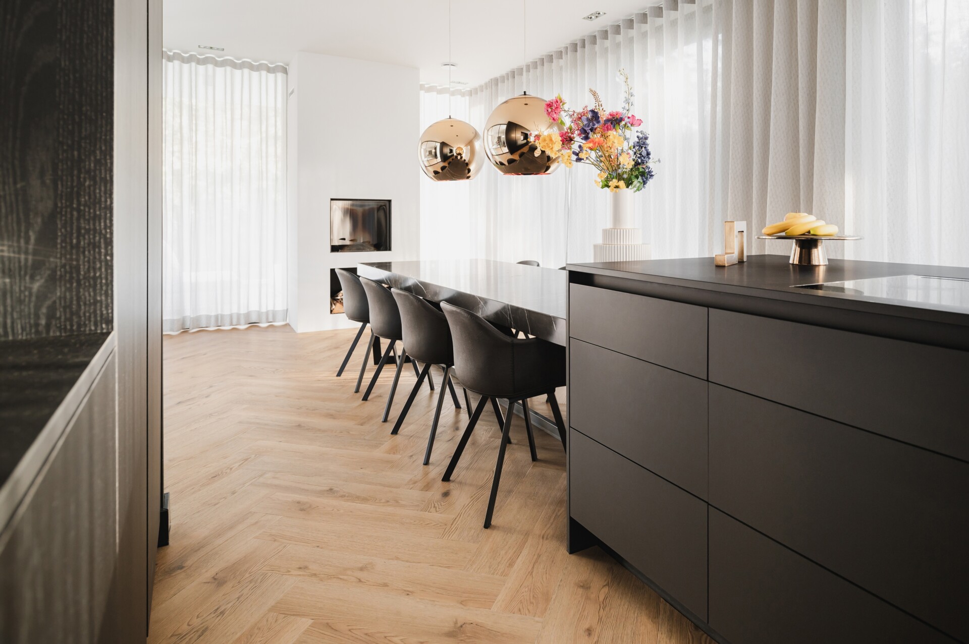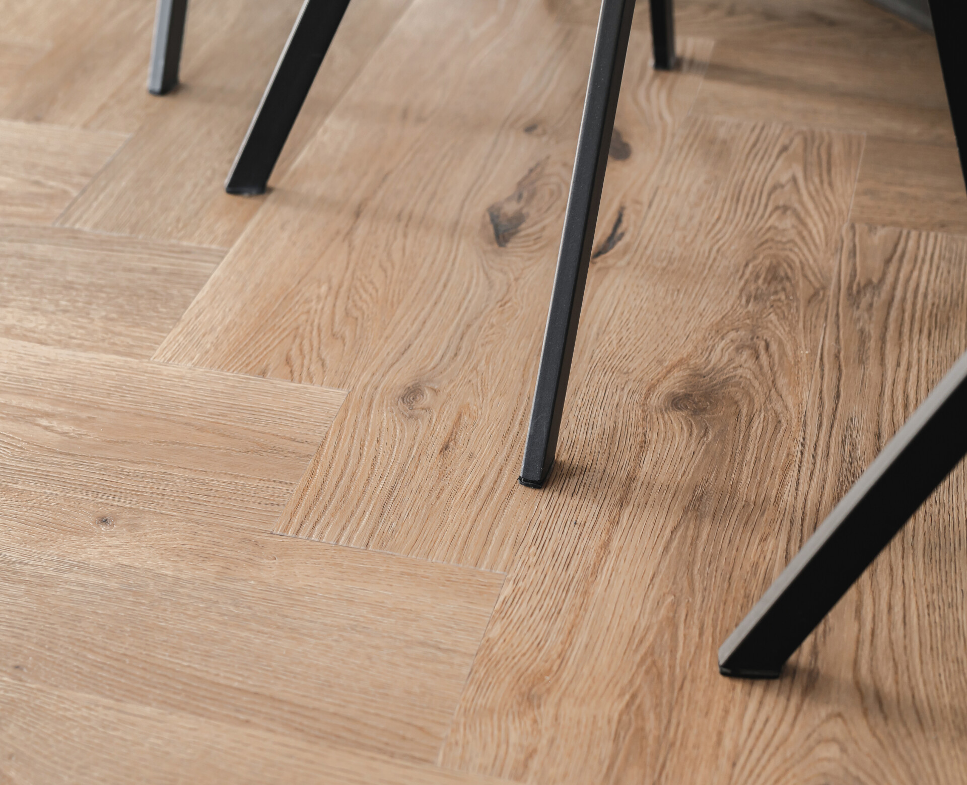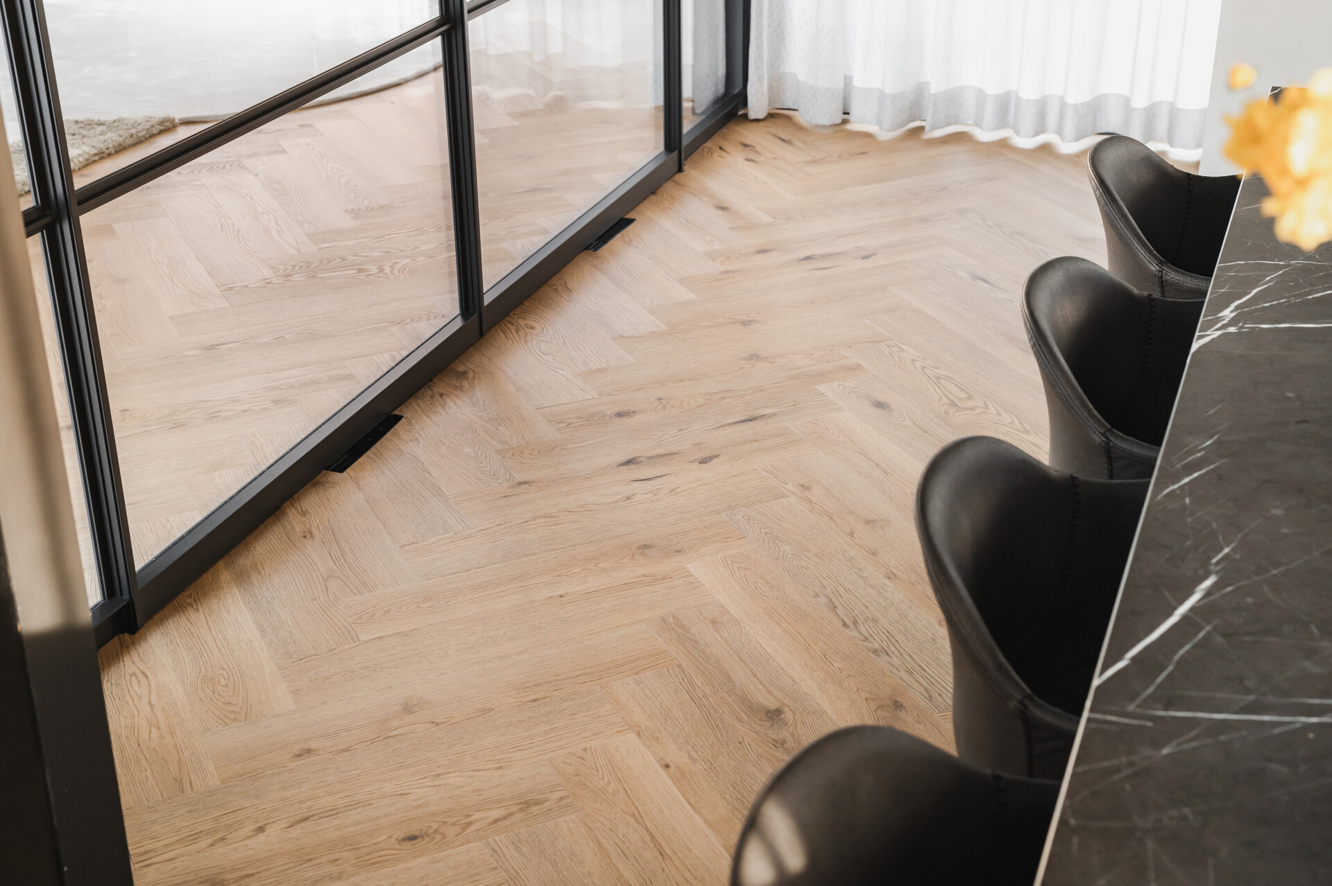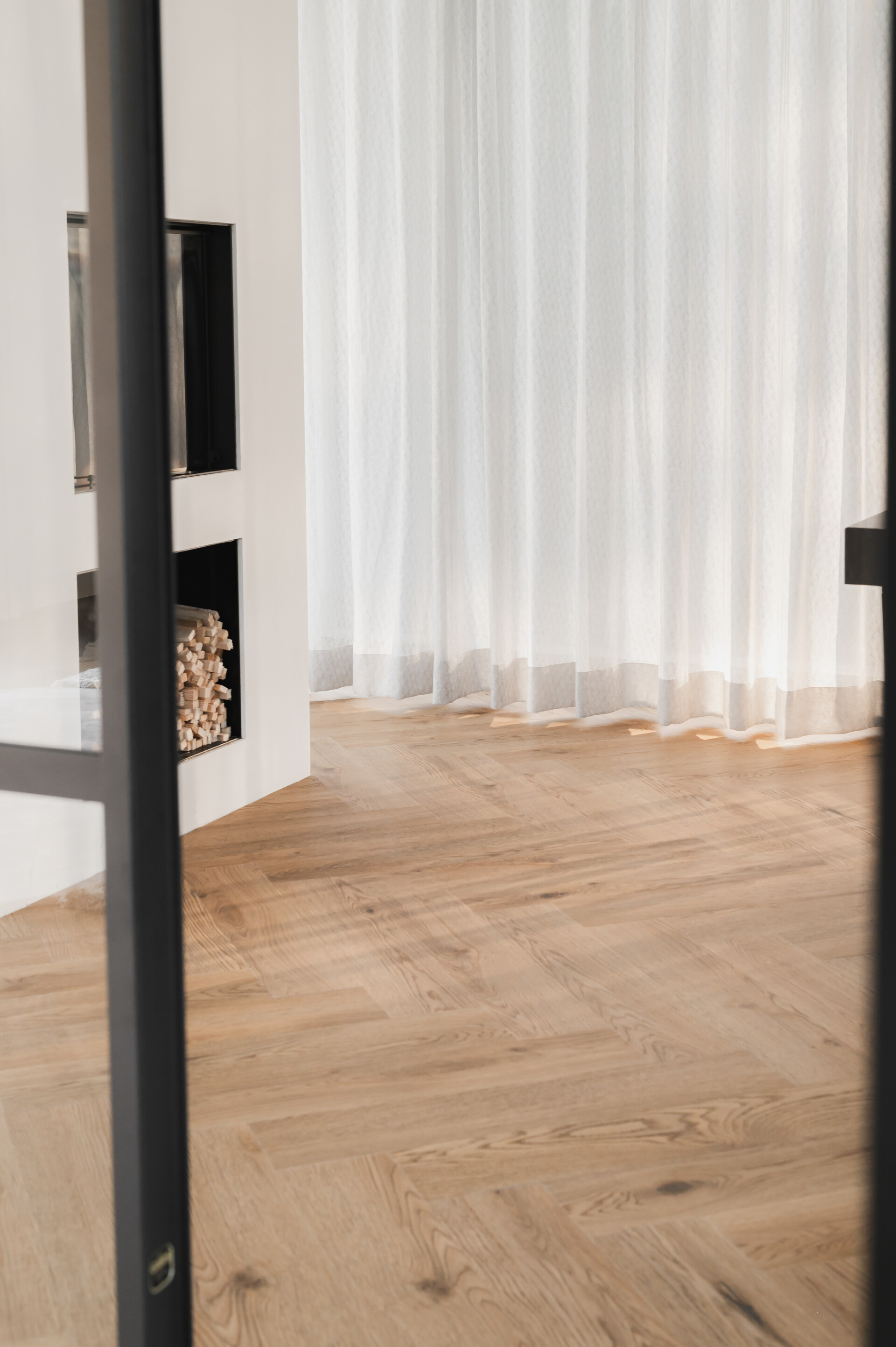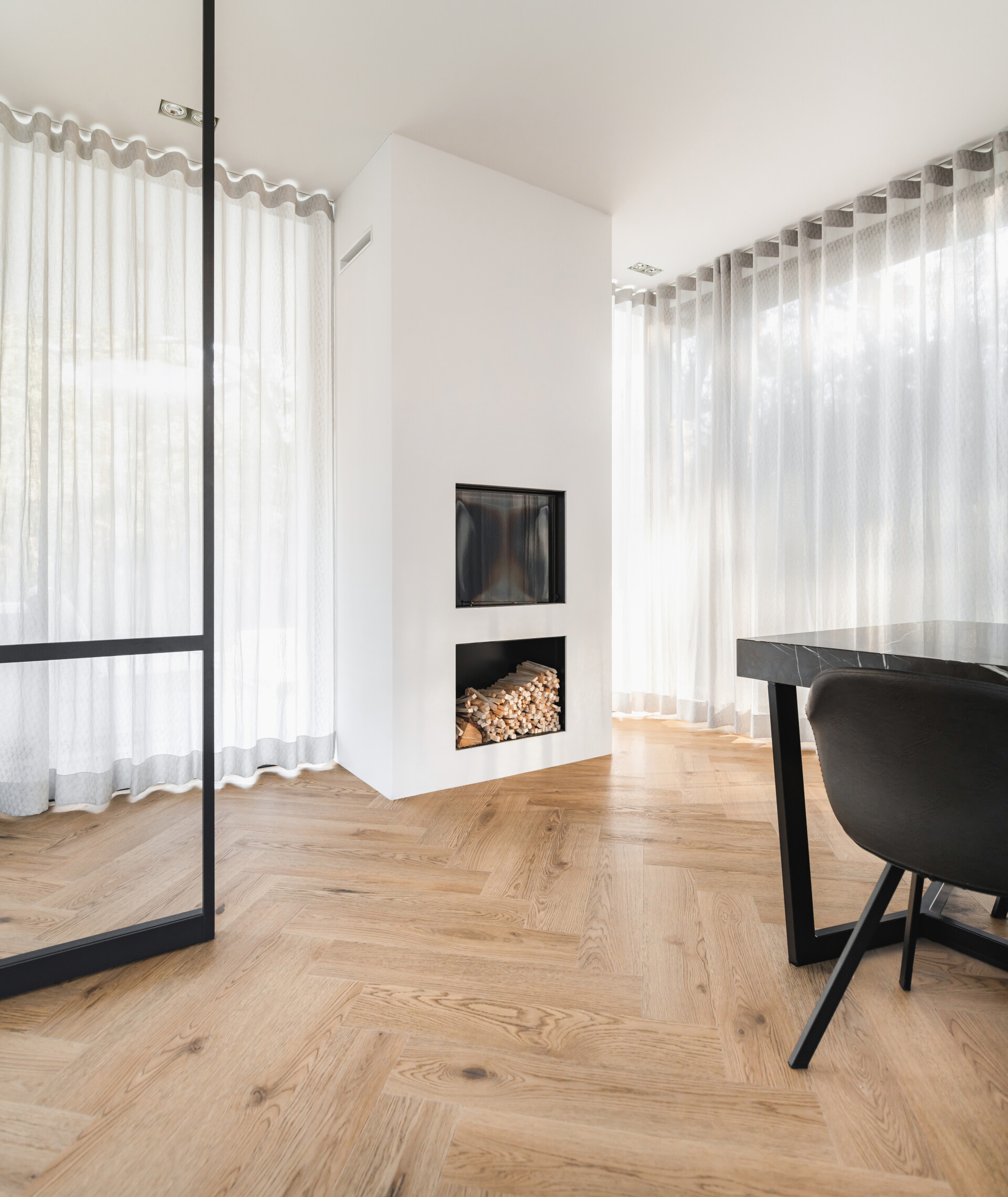 Ciepła podłoga w jodełkę, wykorzystanie marmuru w oparciu o czarno-białą paletę kolorów tworzą solidny fundament tej kuchni. Przytulny kominek w połączeniu z podłogą w jodełkę Authentic wzmacnia wrażenie otwartości. Podłoga składa się z 4 ciepłych kolorów, w których sęki są wyraźnie obecne. Dostępna w długich deskach i odmianach w jodełkę.