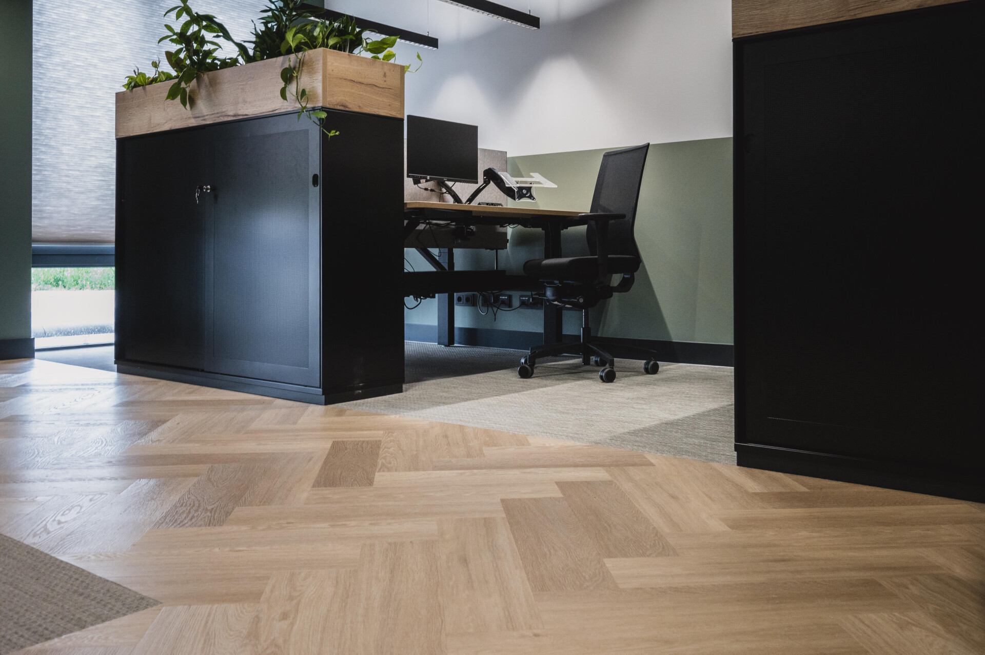 Nathalie z Interiorboost była zaangażowana w realizację tego nowego miejsca pracy od A do Z. W tym projekcie wybrała Chevron 6041, jasną dębową podłogę, która tworzy idealną bazę.