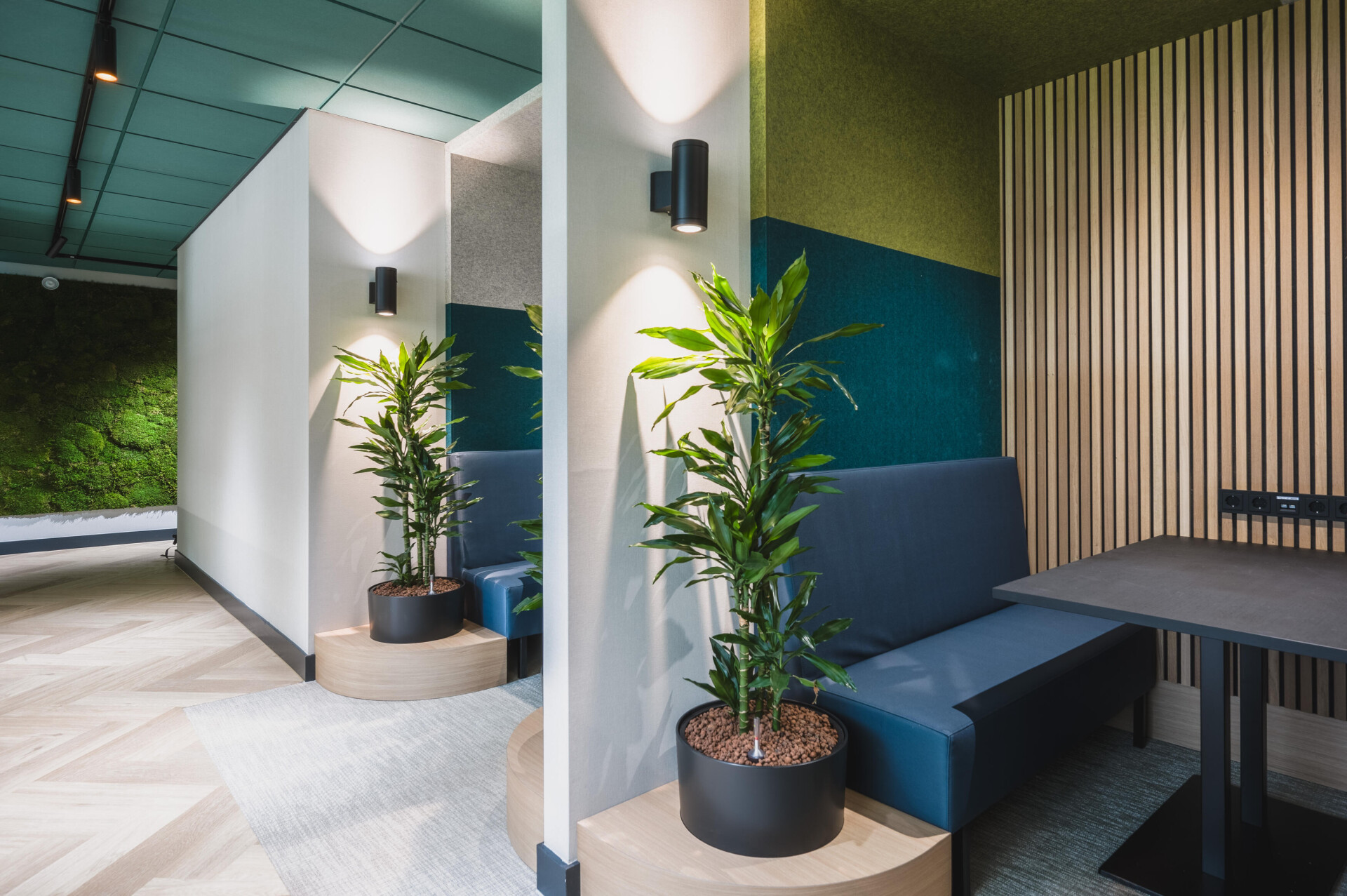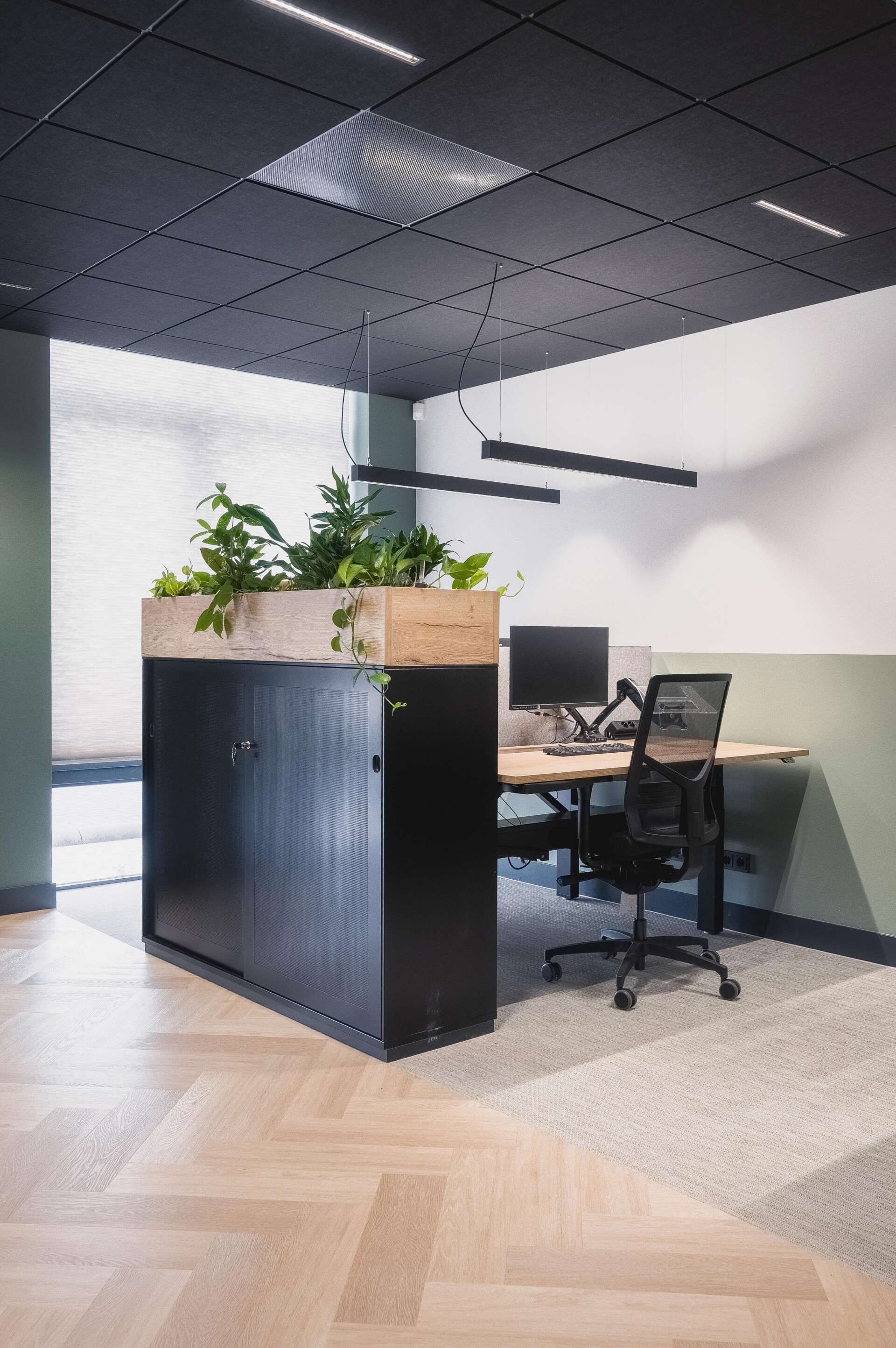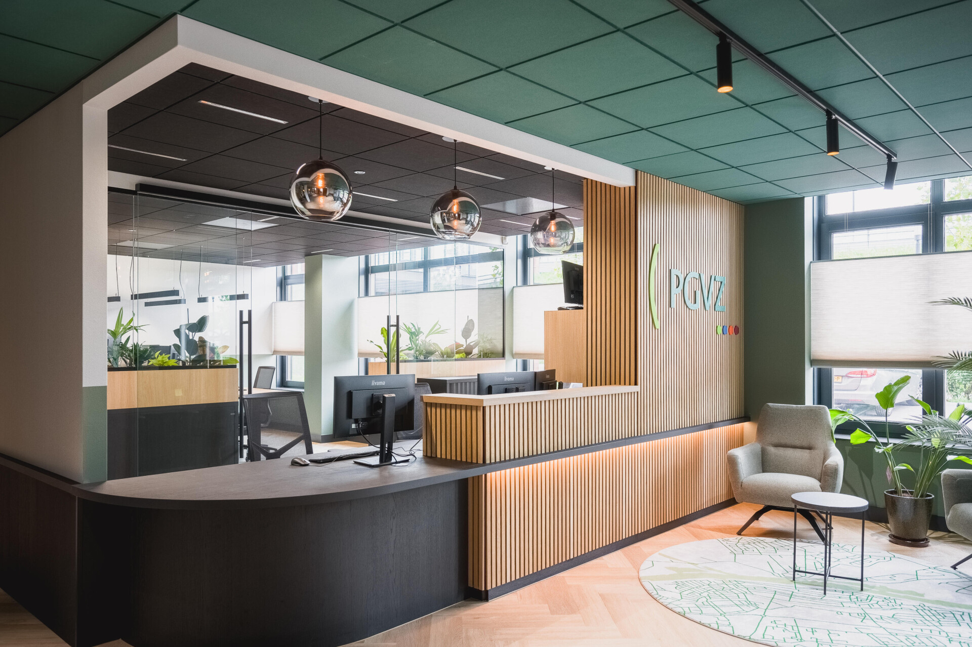Nowa siedziba główna zasługuje na nowe i odpowiednie wnętrze. Motyw przewodni tego projektu został zaczerpnięty z identyfikacji wizualnej PGVZ Opieka Domowa: koloru zielonego. Połączono go ze spokojnymi barwami i naturalnymi materiałami, aby stworzyć relaksujące miejsce pracy. Przestrzenie oddzielone są szklanymi ścianami, co tworzy otwarte i dynamiczne środowisko, dające poczucie gościnności.